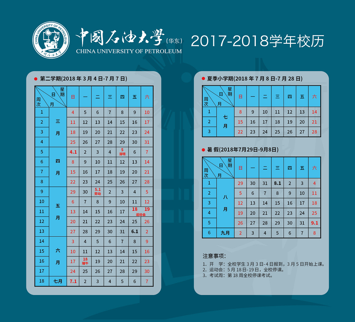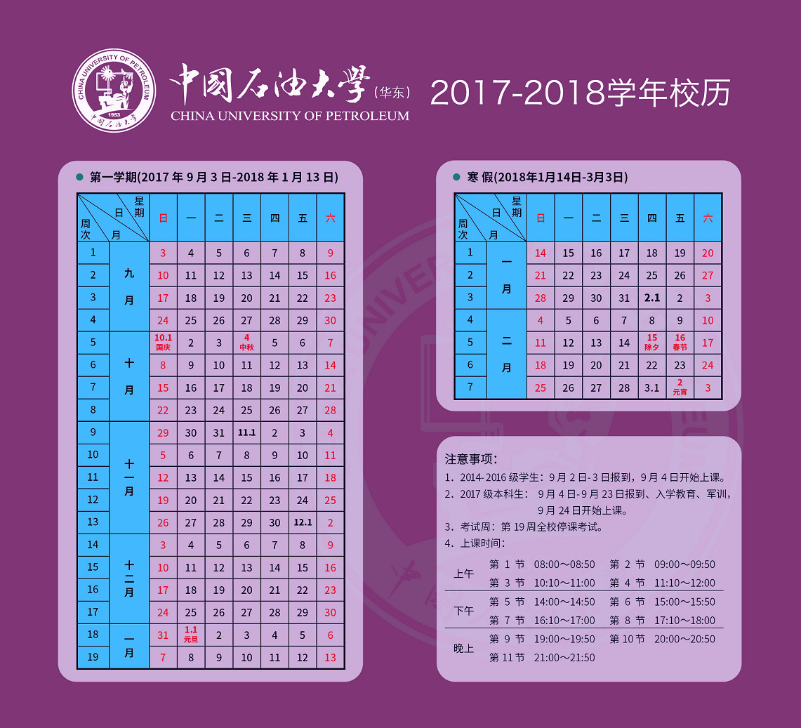 中国石油大学(华东)2017-2018学年校历
