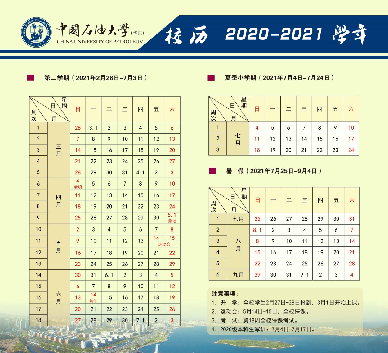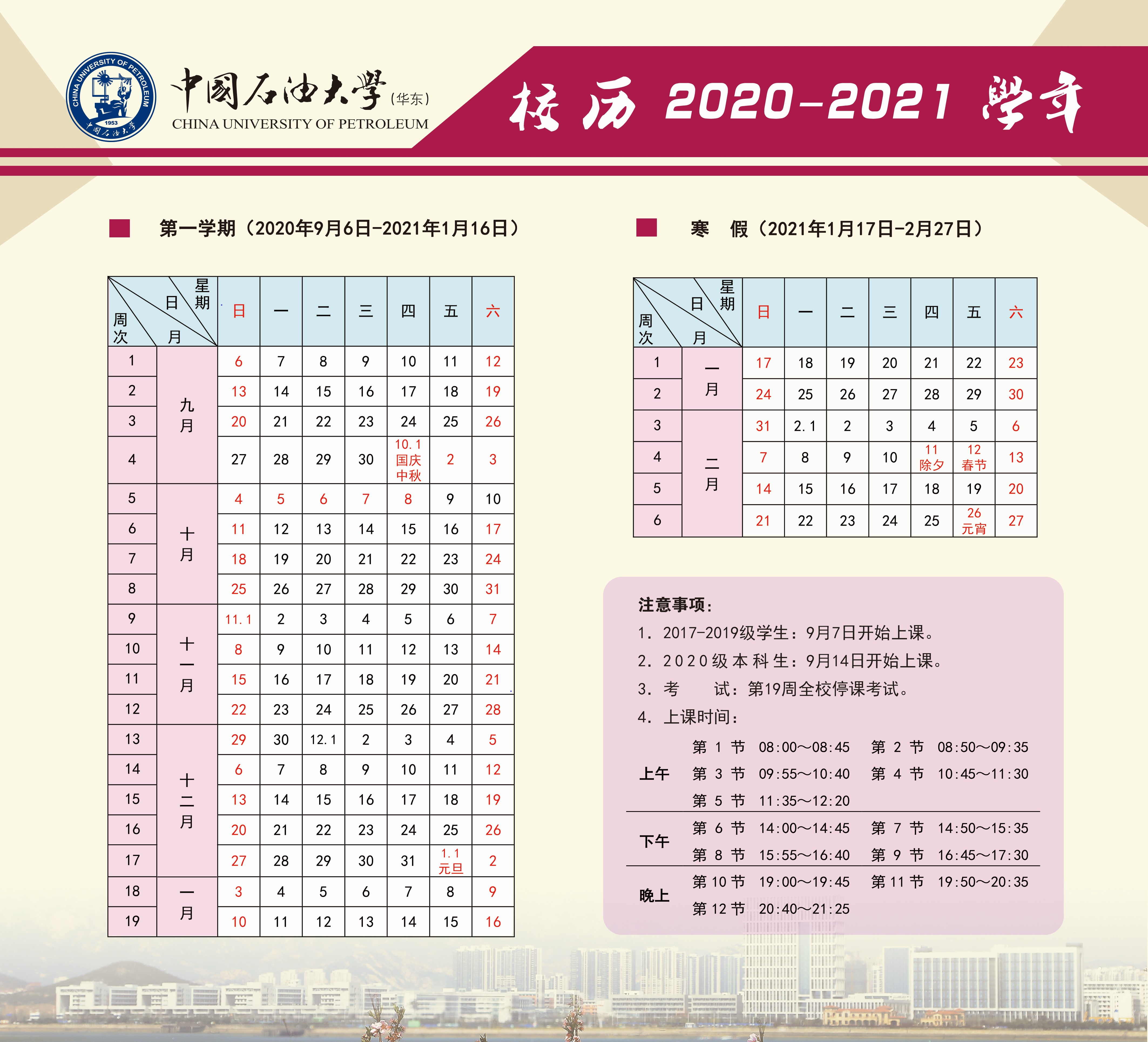 中国石油大学(华东)2020-2021学年校历