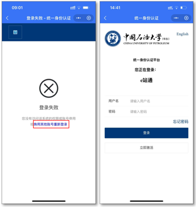 2.微信小程序登录“e站通”时,如果提示“登录失败”,请点击“使用其他账号重新登陆”,输入统一身份用户名和密码,点击登录即可。