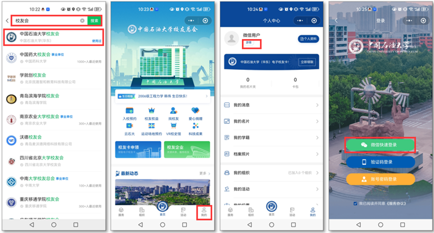 1.校友从微信小程序中搜索“中国石油大学校友会”,点击右下角“我的”,在“个人中心”页面点击“游客”,在弹出登录页面上,推荐选择“微信快速登录”,在实名认证页面输入“姓名”和“身份证号”,推荐选择“人脸识别认证”,认证通过后“返回个人中心”,点击“我的消息”,即可看到已经激活的统一身份用户名和密码。