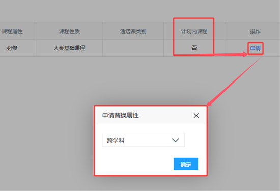 2.选择“计划内课程”为“否”的课程,点击“申请”,进行替换,申请提交后由所在学院教学秘书老师审核即时生效。